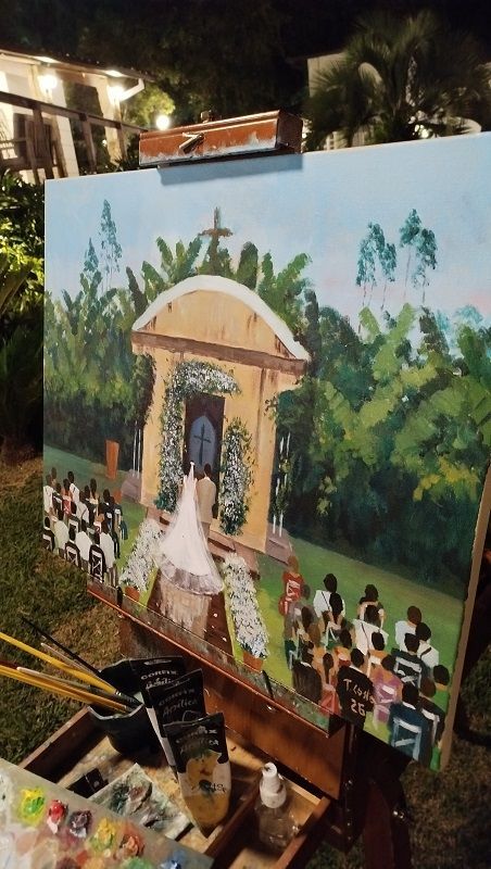 Já pintei ao vivo em uma cerimônia na "Jagoara", e posso dizer que foi uma das cerimônias que mais me marcaram. A recepção aconteceu no gramado que fica nos arredores da igreja.